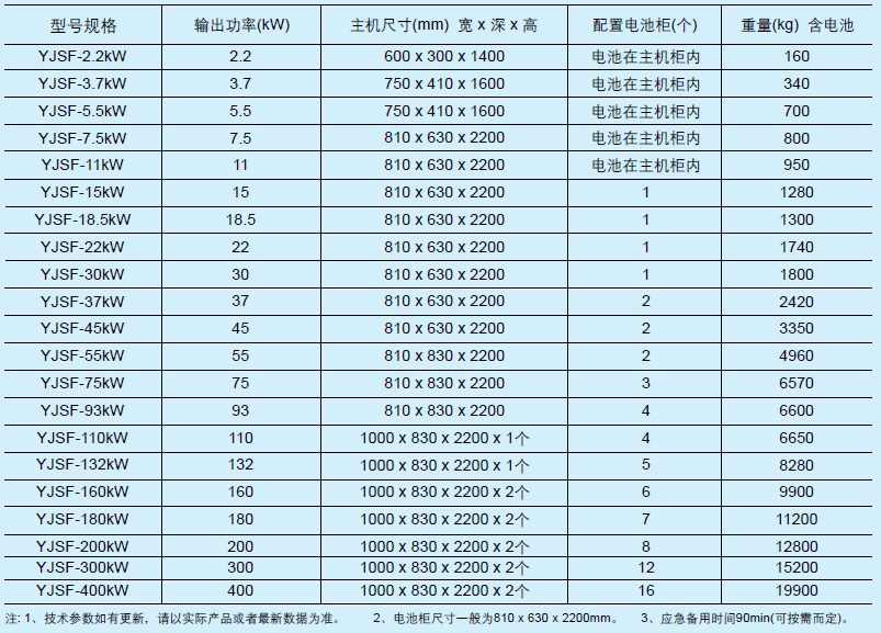 YJSF系列EPS电池配置及尺寸重量一览表