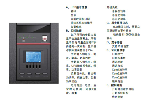 采用由LED发光二极管所构成UPS电源模拟运行流程图和中英文LCD液晶显示屏所构成的人一机对话型的菜单功能,UPS运行状态一目了然;利用可编程自动测试软件对UPS本身和蓄电池执行定期的功能性测试,利于发现和消除故障隐患。利用软件重新调整UPS的运行参数重新设置各种自动保护电路的新的阀值电平。它极大地增强UPS电源配置的灵活性;通过RS232或RS485接口及其配套电源监控软件,实现远程监控,可以自动传呼功能。