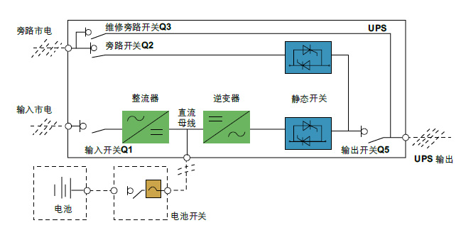 市电正常时,整流器和逆变器同时工作,给负载供电的同时对电池进行充电。当市电异常时,整流器停止工作,转由电池经逆变器向负载供电,若电池电压下降到放电终止电压,而市电还未恢复正常,UPS将关机(如果主旁不同源且旁路正常,系统转由旁路供电)。电池放电终止电压己预先设定。逆变器故障或超载时,还可有外部交流旁路通过旁路开关Q2和静态旁路给负载供电。此外,如果对UPS进行维护或维修,UPS可通过内部的手动控制维修旁路开关Q3给负载供电。UPS正常运行时,除维修旁路开关外,其它所有的开关均闭合。