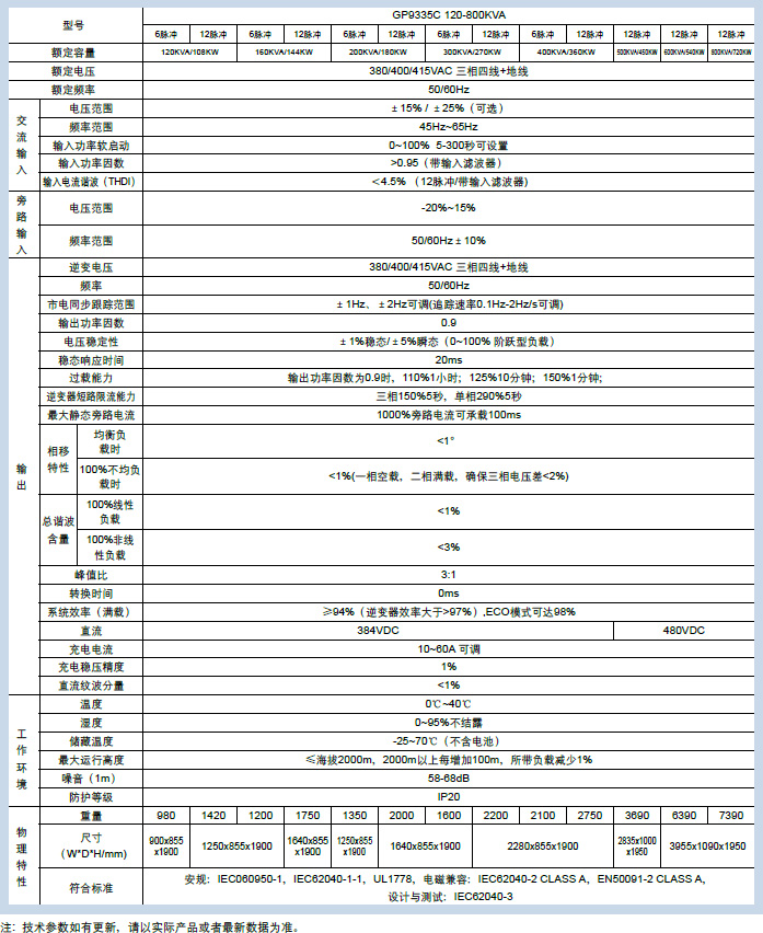GP9335C 120/800KVA系列UPS采用真正的在线双转换的架构,几乎可以完全解决所有的电源问题,如断电、市电高、低压、电压瞬时跌落、减幅振荡、高压脉冲、电压波动、 浪涌电压、谐波失真、杂波干扰、频率波动等电源问题。可向负载提供连续、稳定、纯净、安全可靠的正弦波电源。