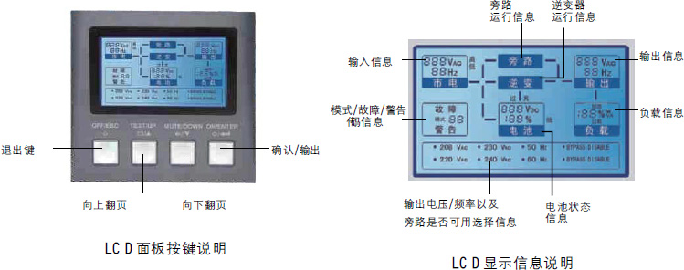LCD中英文显示面板,向用户准确地显示UPS工作环境和工作状况信息,在LCD显示面板上设置输出电压和频率,方便用户操作。